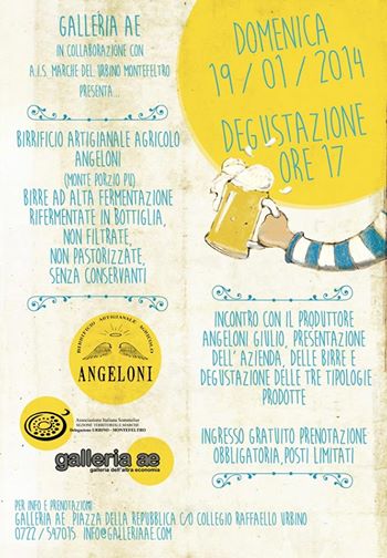 Domenica 19 gennaio,organizziamo in negozio una degustazione gratuita delle birre dell’azienda “Angeloni” di Monte Porzio.Il titolare ci illustrerà le sue birre e ci guiderà nella degustazione.Se siete interessati a partecipare prenotate inviando un’e-mail a info@galleriaae.com oppure telefonando al 0722547015. Buon week-end a tutti!