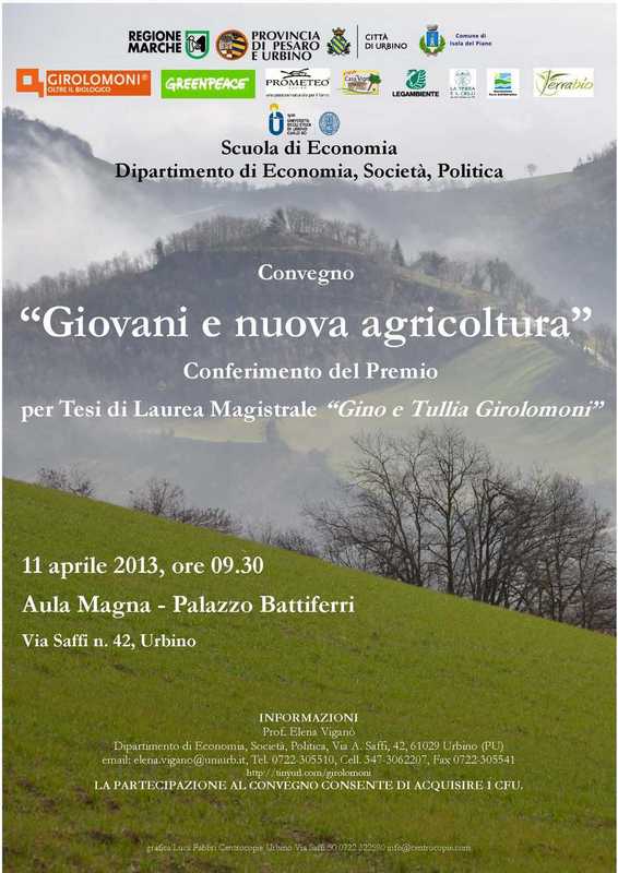 Giovedi 11 aprile si terrà il convegno “Giovani e nuova agricoltura” presso l’Aula Magna di Palazzo Battiferri ad Urbino . Per visualizzare il programma del convegno vedi http://tinyurl.com/girolomoni.